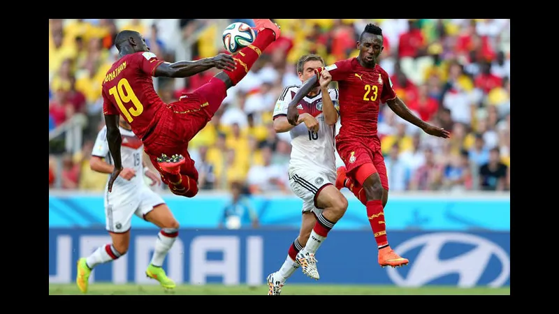 Cầu thủ Đức và Ghana đối mặt trong tình huống tranh chấp quả bóng